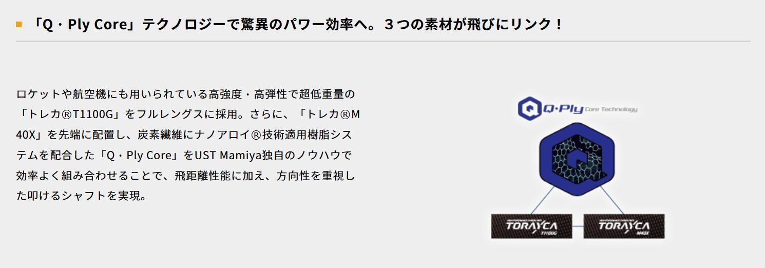ロケットや航空機にも用いられている高強度・高弾性で超低重量の「トレカ®T1100G」をフルレングスに採用。さらに、「トレカ®M40X」を先端に配置し、炭素繊維にナノアロイ®技術適用樹脂システムを配合した「Q・Ply Core」をUST Mamiya独自のノウハウで効率よく組み合わせることで、飛距離性能に加え、方向性を重視した叩けるシャフトを実現。