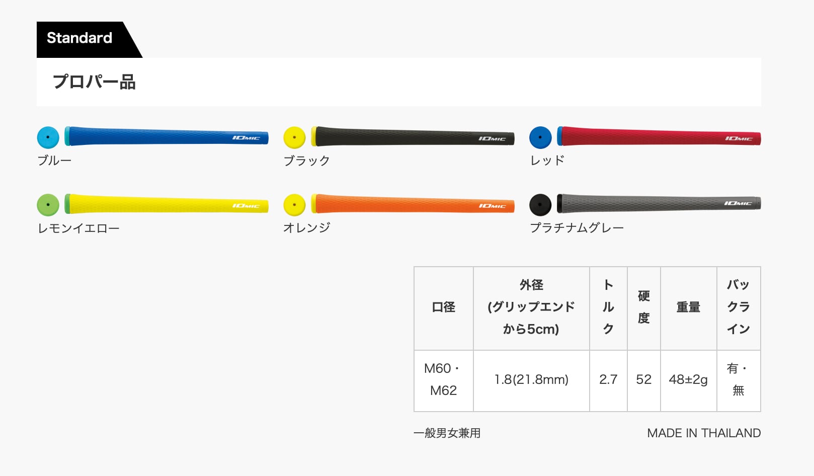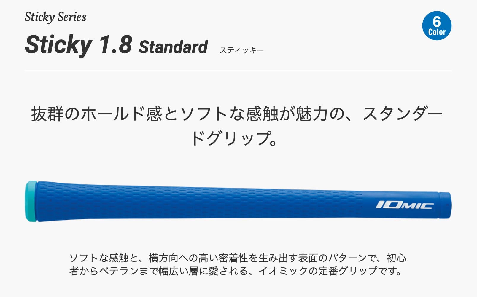ソフトな感触と、横方向への高い密着性を生み出す表面のパターンで、初心者からベテランまで幅広い層に愛される、イオミックの定番グリップです。