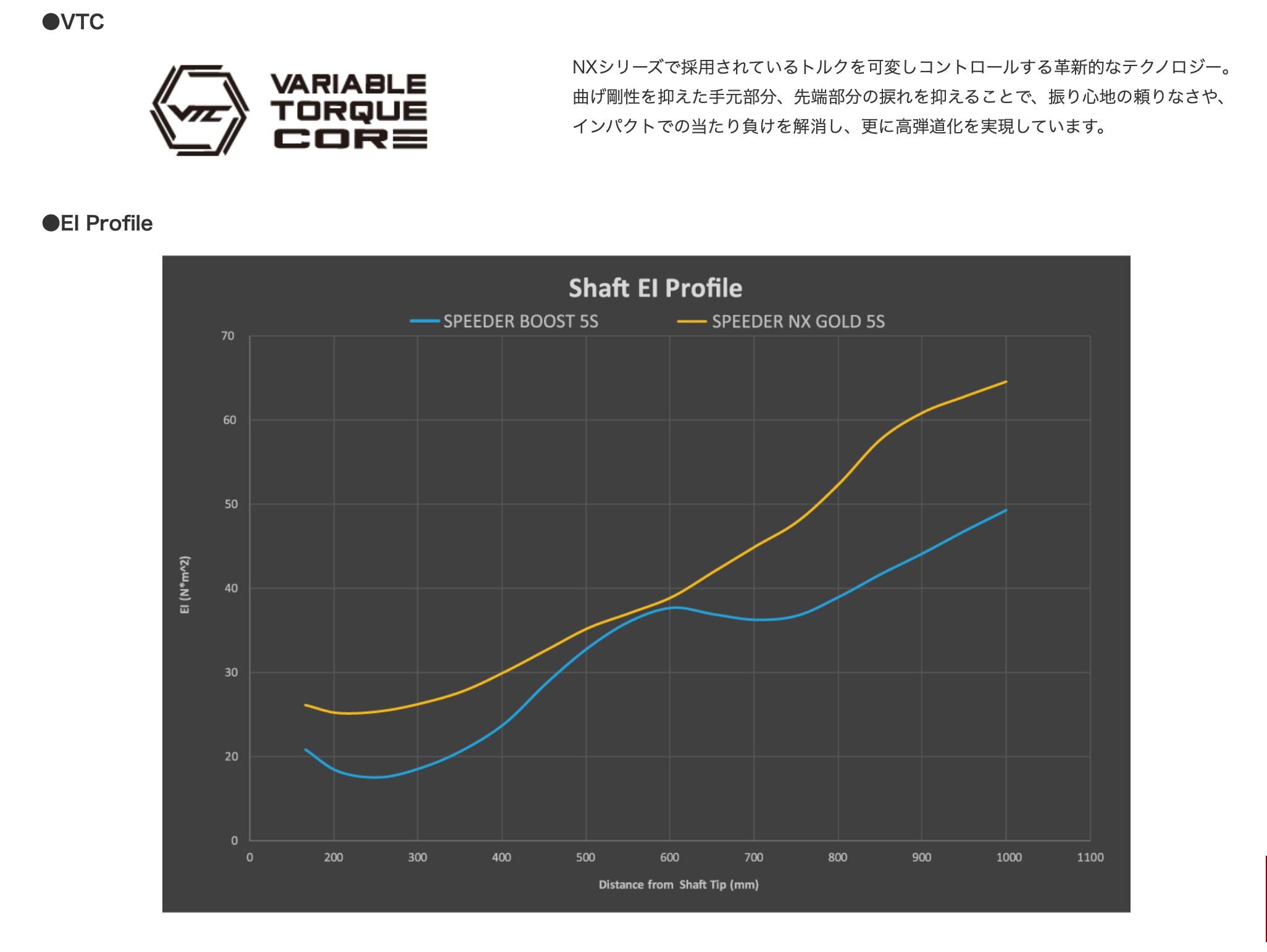 SPEEDER NXシリーズに搭載されているVTCテクノロジーに加え、手元部分と先端部分の曲げ剛性を意図的に抑えた「VTC×ダブルキック」シャフト。 一般的に軟らかいシャフトにありがちな「振り心地の頼りなさ」や「インパクト時の物足りなさ」をVTCテクノロジーによって解消しました。 シャフトの運動量を最大化することで、誰でも明確なしなりを実感。