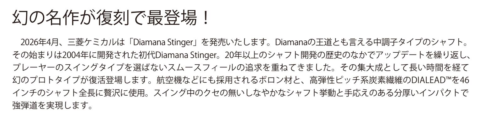 その始まりは2004年に開発された初代Diamana Stinger。20年以上のシャフト開発の歴史のなかでアップデートを繰り返し、プレーヤーのスイングタイプを選ばないスムースフィールの追求を重ねてきました。その集大成として長い時間を経て幻のプロトタイプが復活登場します。航空機などにも採用されるボロン材と、高弾性ピッチ系炭素繊維のDIALEAD™Wを46インチのシャフト全長に贅沢に使用。スイング中のクセの無いしなやかなシャフト挙動と手応えのある分厚いインパクトで強弾道を実現します。