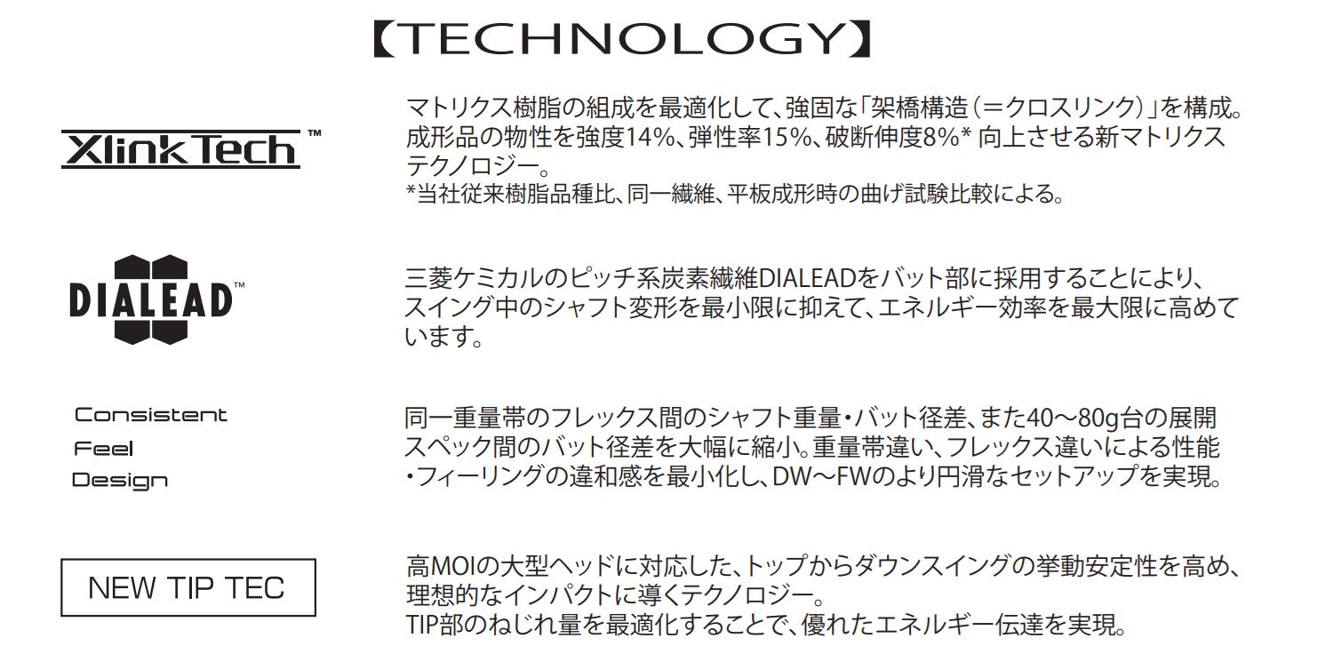 手元からチップまで変曲点の無いなだらかな剛性によって、多くの プレイヤーが求める自然なしなり戻りを実現するとともに、高慣性 モーメントのヘッドに対してもスイートエリアでインパクト出来る様に デザインしました。