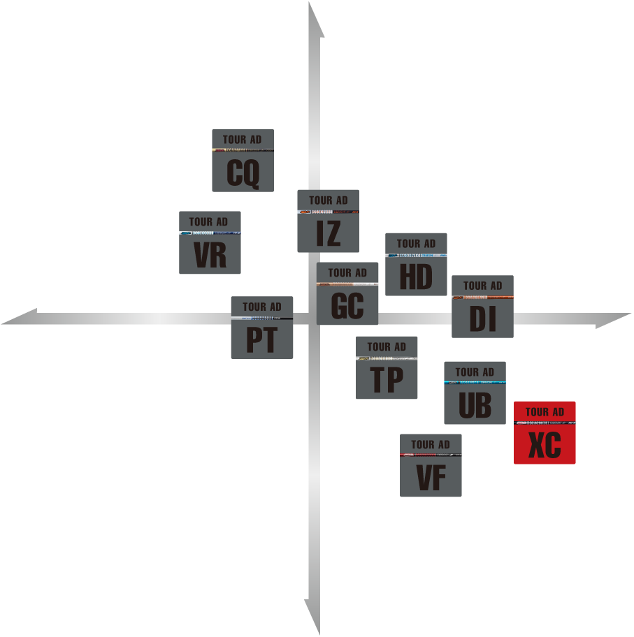 「TOUR AD XC」は、現在のウッドの主流となっている飛距離追求型フェース構造を最大限に活かすシャフトです。新素材カーボン「トレカ®M40X」を先端から中間部に使用し、先端部には「トレカ®T1100G」を使用することでインパクト時のパワーロスを極限まで軽減し先端挙動が安定することから、打点のばらつきを抑え、その結果ボール初速も向上させます。